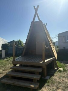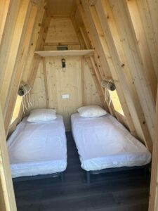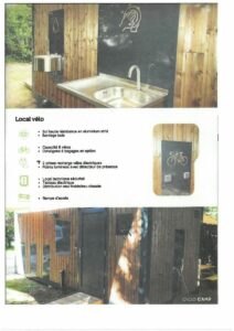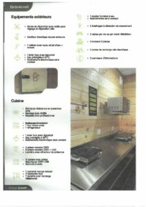 Location de cabadiennes à la nuitée, avec un accès à une base de vie équipée d’une kitchenette et ses ustensiles, frigo, cafetière, micro onde, casiers à code.